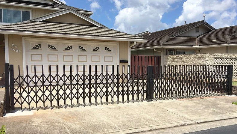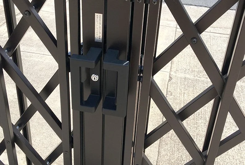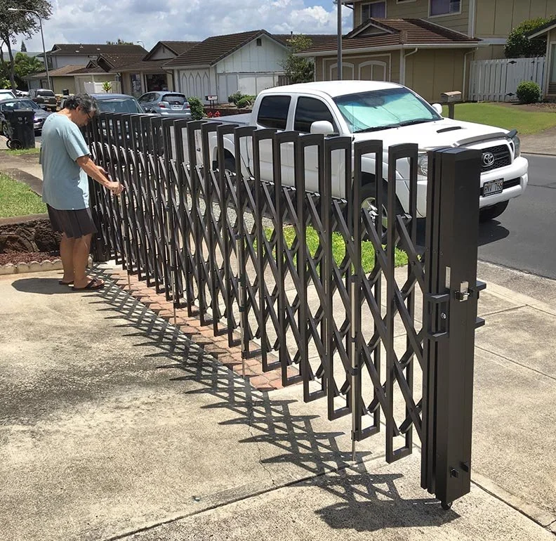 This Japanese accordion gate can float across a driveway without casters to close up spaces as wide as 40 feet (double gate.) As it expands, it releases a wheel to support the front end. Sturdy lockdown sticks can be released at intervals to secure the gates in the closed position.