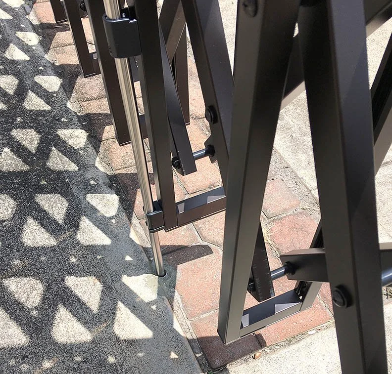 An accordion gate retracts into a small stack. This stack can turn around the post completely out of the way; however, for this installation, that was not possible. Because of the slope in the driveway, it cannot turn inward, and you are not allowed to turn into a sidewalk. Therefore, the gate can only stack up left and right.