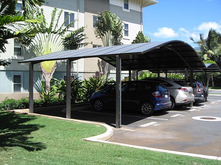 The Japanese Modern Carport System PJ offers a versatile solution for multi-family parking lots. Featuring aluminum profile ports from Japan, it's ideal for condominiums and large parking areas. Since 2019, the curved KC system has been redesigned to the PJ Port System, allowing multiple units to connect into a water-tight roof.