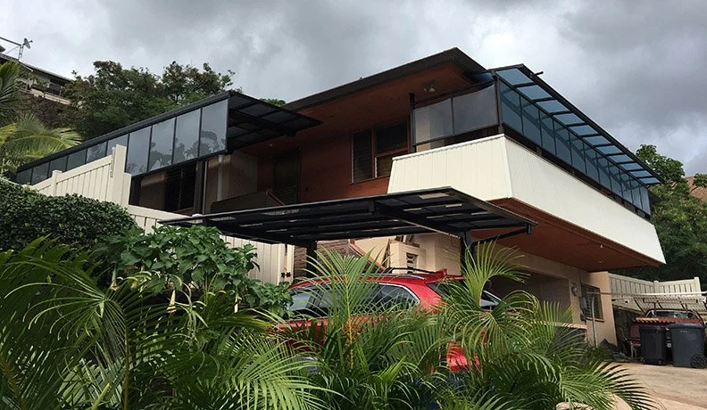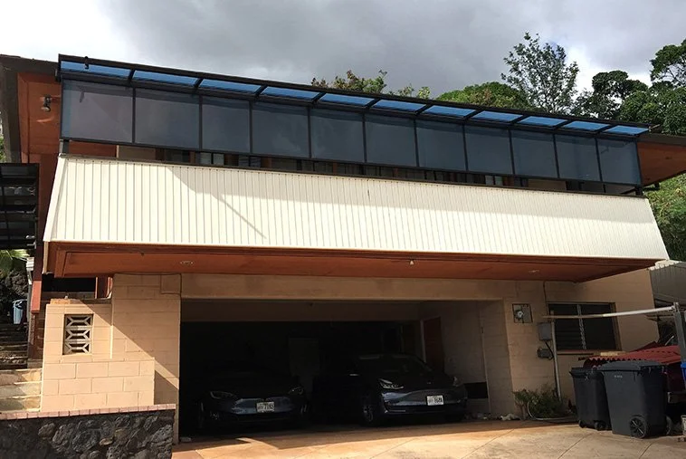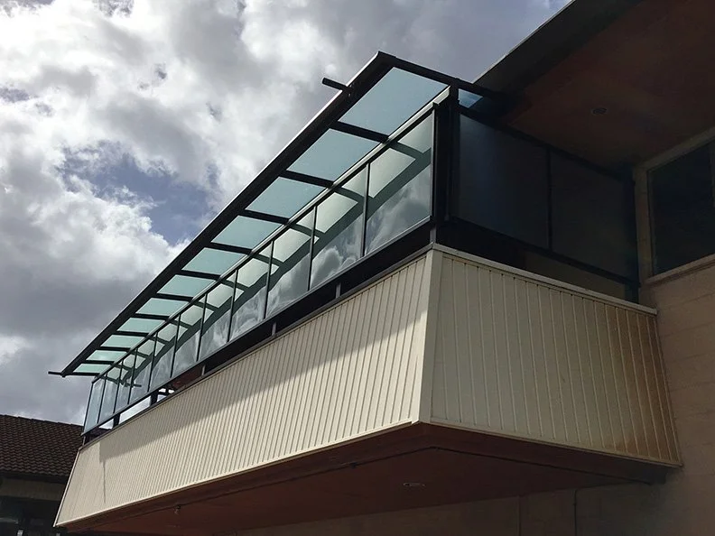 Upstairs balconies and walkways are prone to deterioration if not protected from the weather. Because an upstairs patio cover must be surface-mounted, our lightweight aluminum patio cover system (REVOLU COVERS) from Japan is a perfect solution. Made of anodized profiles, the aluminum metal roof is maintenance-free and provides a 100% watertight cover, equipped with heat-cutting polycarbonate roof panels. See all panel choices.