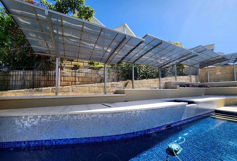 Here we see the popular LJ Port, which slopes the roof from the back to the front. To span across the pool, a long bearing beam from the U-Style Series has been employed.