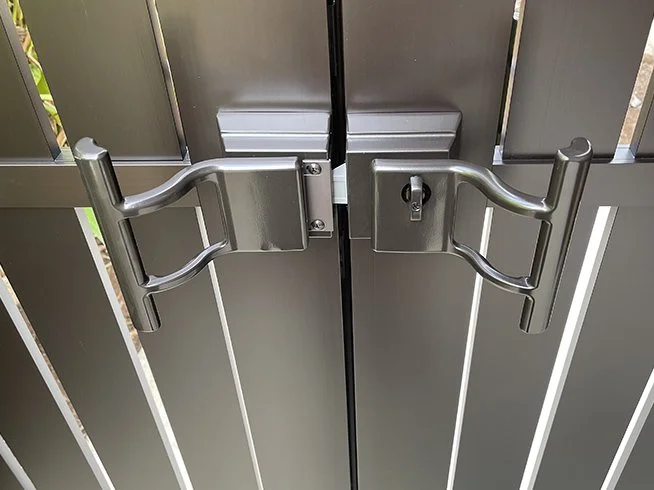 The handles on this gate for the side yard are push-pull handles. This means you can operate them with your elbows when bringing in your groceries. However, if it's locked, you will still need the key or, in this case, flip the thumb turn from the inside.