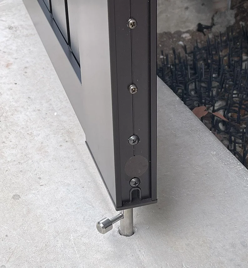 Our high-tech aluminum garden gates can swing inwards, like in this example, or outward, depending on your choice. Hinges will always be installed on the backside for security. If the panel needs to swing outward, an additional aluminum extender is used. Here is an example.